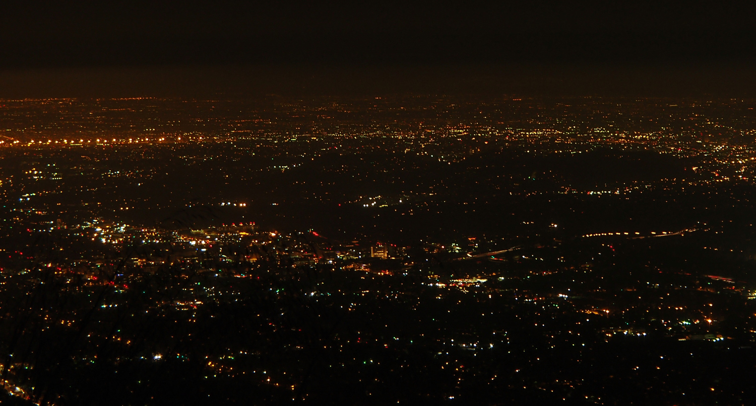 At center is Glendale, left of center is the Verdugo Hills; right of center is Mt Lee, downtown LA thru the gap, and Hollywood Hills to the right. In the foreground is the beautiful San Fernando Valley. |